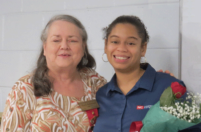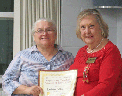 Awards Chair Dr. Sylvia Alston (right) presents Robin Edwards with a Gamma Chi Beginning Teacher of Excellence certificate. She will be nominated for the NC DKG Beginning Teacher of Excellence Award to be given at the NC DKG Convention in April. |
