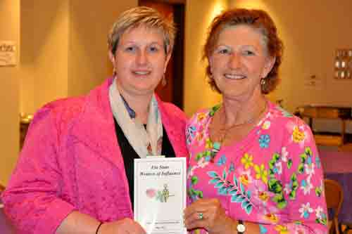 May 6, 2011 Gamma Chi's Woman of Influence Emmy Coleman (left) holding the book Eta State Women of Influence containing her bio is congratulated by her mother, Elaine Coleman |