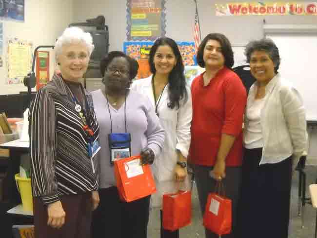 Presentation by Gamma Chi members of goodie bags to the three new teachers at Mariam Boyd Elementary School (from left to right)