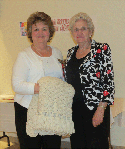 May 2, 2013 Mary Catherine Harris (left) is the lucky winner of a lovely afghan crocheted and donated by Josephine Myrick, mother of member Sylvia Alston, to help raise money for our Scholarship/Grant Fund |