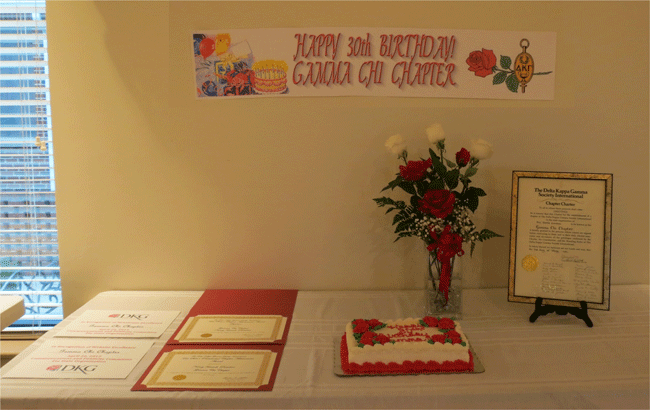 May 2, 2013 Celebration Table (from left to right on display) Our Newsletter and Website Excellence Certificates, our Superior Chapter Achievement and Presidential certificates, our 30th birthday cake, our engraved crystal vase for our Presidential Award and our Charter |