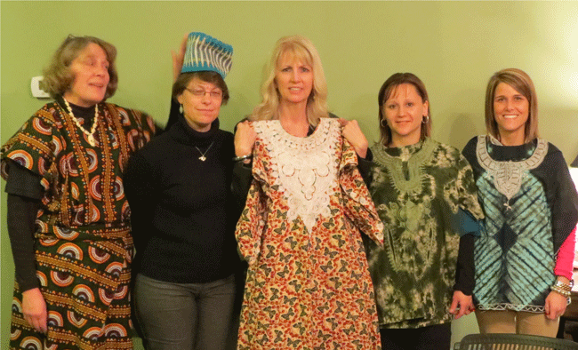Betty Anne Shearin wears an African outfit, models: Karen Paynter wears a hat, Laura Kearney holds a dress, and