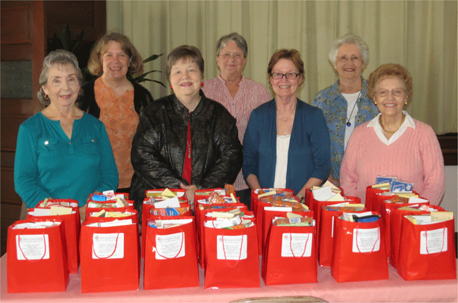 November 18, 2013 Stuffing the New Teachers Bags with 29 Goodie Bags ready for distribution From left to right: Ann Kilian, Betty Anne Shearin, Nancy Tunstall, Mary Austell, Jeffrey Evans, Mary Brodie Raiford and Shirley White; Bags contained 3 packs of kleenexes, glue stick, 2 pencils & 2 erasers, highlighter, 10 peppermints, 4 dry erase markers, dry erase eraser, 2 pens, 2 nabs, 2 large notepads, sticky pad, 2 packages of popcorn, first aid kit, Gamma Chi calculator, Gamma Chi brochure & bookmark and president's business card with a handwritten note on the back of it |