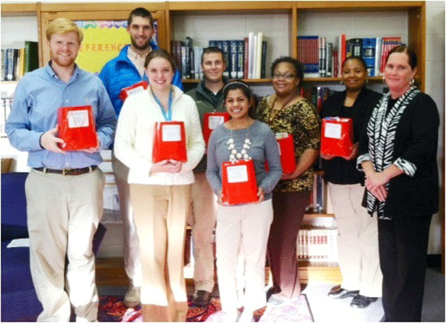 presents goodie bags to the new teachers at Warren County High School, (front row from left to right) Jeffrey White,