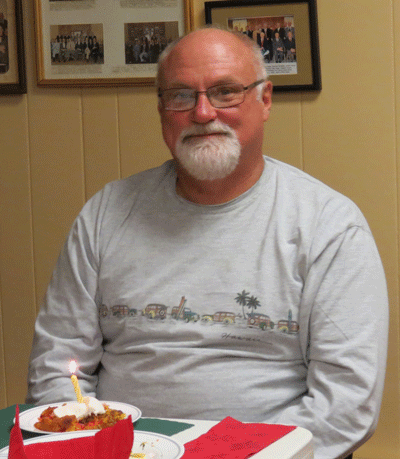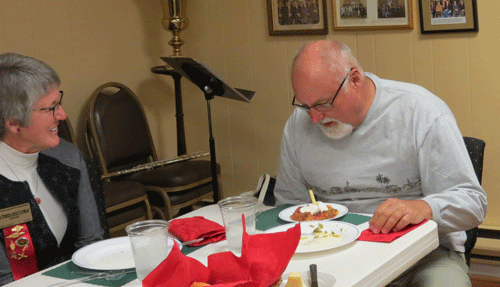 December 5, 2019 - Mike Cowan was surprised when he was presented with a lit piece of cherry dump cake on his birthday |
