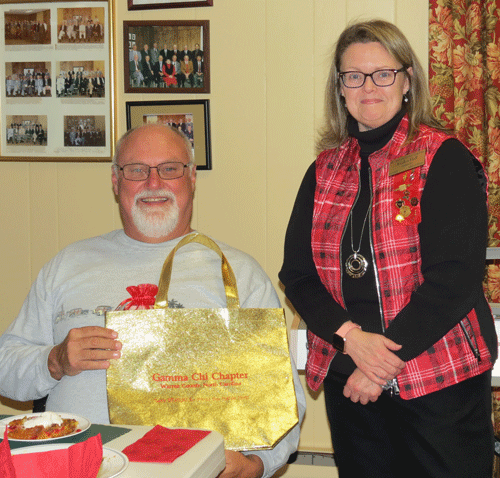 December 5, 2019 - President Evelyn Hall presents Mike with a card stating that a donation will be made to the NC DKG Educational Foundation in honor of his birthday, a Gamma Chi Chapter bag with our theme "Let's Sparkle--From the Inside Out!" and a packet of flower seeds with the NC DKG theme "Ready, Set, GROW!" |