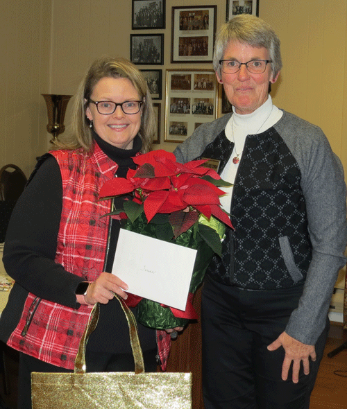 December 5, 2019 - Gamma Chi President Evelyn Hall (left) presents NC DKG President Dr. Teresa Cowan with a card stating that Gamma Chi Chapter will be making a donation to the NC DKG Educational Foundation in her honor along with a poinsettia and Gamma Chi bag |