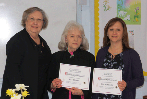 March 7, 2019 - Awards Committee Chair Dr. Sylvia Alston, left, presents milestone awards to Kay Beaver and Chris Skinner |
