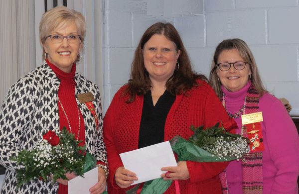 March 7, 2019 - President Evelyn Hall, right, presents roses to Debra Clayton, left, and Patricial Williamson; they had planned to present a program on their trip to the Dominican Republic in the summer of 2018, but due to technical difficulties, their program is postponed until a later date; also, they were given cards stating that a donation would be made in their honor to the NC DKG Educational Fund |
