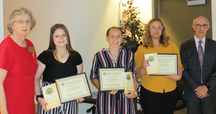 May 7, 2019 - (Meeting is at the St. Paul's Lutheran Church) Nancy Blankenship Grant-in Aid Awards, from left, Scholarship Committee Chair Betsy Clark, Hailey Stroud, Faith Heisler, Ellen Denning and Presenter Richard Blankenship |