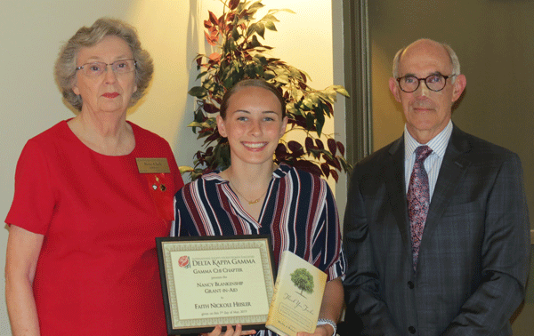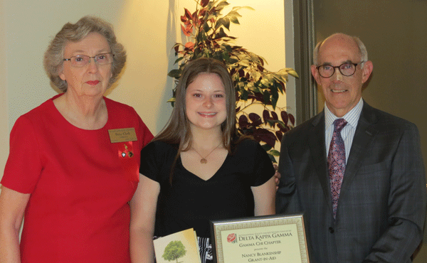 May 7, 2019 - Nancy Blankenship Grant-in Aid Award, from left, Scholarship Committee Chair Betsy Clark, Faith Heisler, and Presenter Richard Blankenship |