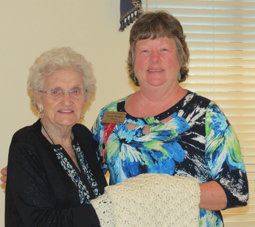 May 7, 2019 - Josephine Myrick, left, who donates an afghan each year to be raffled off with sales going to the Gamma Chi Scholarship and Grant Fund, drew the winning ticket; the winner, Elaine Coleman, was not present, but Afghan Committee Chair Danylu Hundley will deliver the afghan to her |