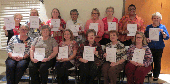 September 17, 2019 - Perfect Attendance recipients: front row from left to right, Mary Austell, Ginny Bernard, Gail Coleman, Nancy Tunstall, Linda Hall, and Evelyn Hall; back row from left to right, Shirley White, Dr. Sylvia Alston, Sheila Robertson, Norma Retzlaff, Sallye Duncan, Betsy Clark, Aimee Anderson and Mary Catherine Harris; not pictured: Diane Colin and Jenny O’Meara |