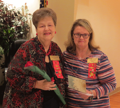 September 17, 2019 - President Evelyn Hall (right) presents Nancy Tunstall with a rose and card stating that Gamma Chi has made a donation to the Gamma Chi Scholarship Fund in memory of her husband, Ed Tunstall |