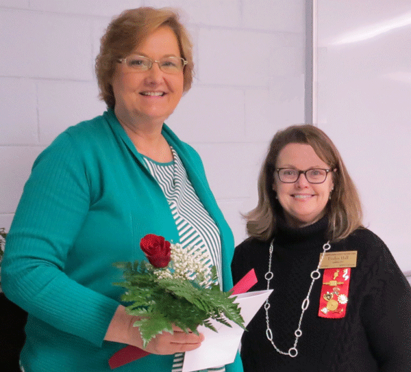 March 5, 2020 - In appreciation for her presentation on the medical accomplishments of Cicely Saunders, the founder of modern hospice care, President Evelyn Hall, right, presents member Donna Liles with a long stem red rose and a card stating that the Gamma Chi Chapter will be making a donation to the NC DKG Educational Foundation in her honor |