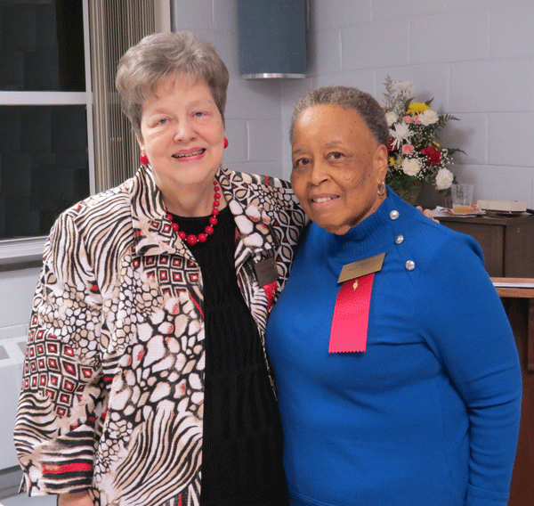 March 5, 2020 - Kathy Stewart (right) was welcomed by Membership Committee member Nancy Tunstall on behalf of the Gamma Chi Chapter; she was presented with her membership key pin and name tag/ribbon |
