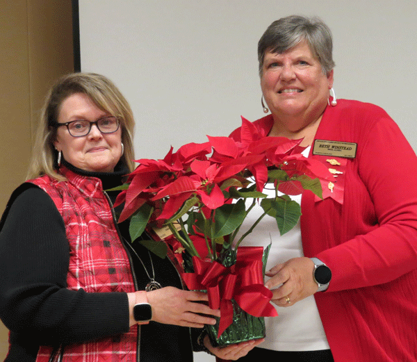 December 7, 2021 - President Evelyn Hall (left) presented NC DKG President Beth Winstead with a poinsettia, a Gamma Chi bag and a card stating that the chapter is honoring President Winstead by making a donation to the NC DKG Educational Foundation in her name |