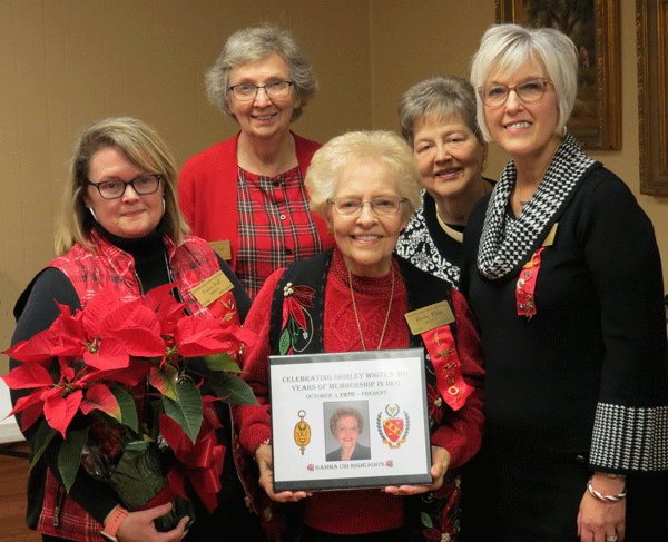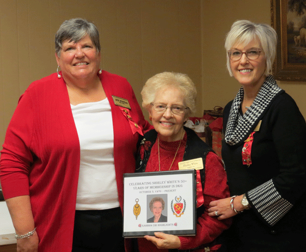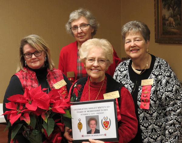 December 7, 2021 - Shirley White (center) is honored for her 50+ years as a member of DKG and as Gamma Chi's only treasurer since the chapter was chartered in 1983; planners of the event are pictured from left, President Evelyn Hall, 1st VP Betsy Clark and Communications & Marketing Chair Nancy Tunstall. |