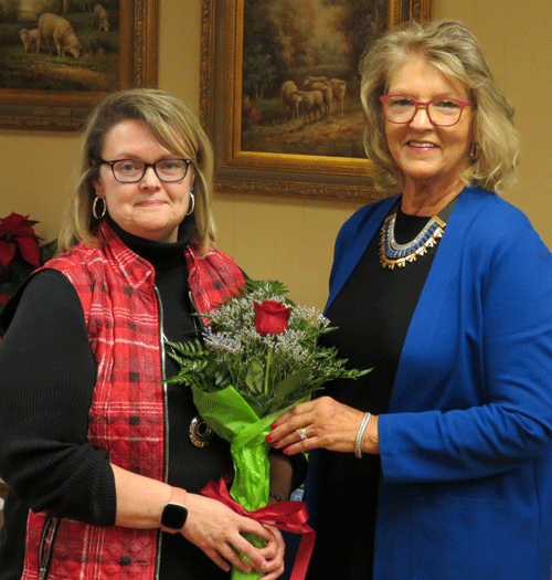 December 7, 2021 - President Evelyn Hall (left) presented Katrinka Brewer with a rose to celebrate her retirement |