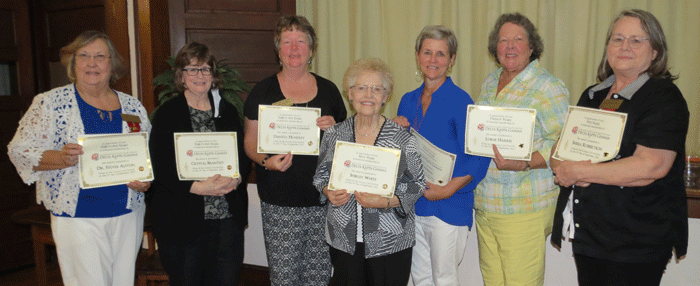 September 2, 2021 - The following members were presented with certificates and pins denoting their years of service in The Delta Kappa Gamma Society International for key women educators. They have given a total of 365 years of service to DKG. From left, Dr. Sylvia Alston (35 years), Crystal Brantley (35 years), Danylu Hundley (35 years), Shirley White (50 years), Jill Coleman (20 years), Loree Harris (20 years) and Sheila Robertson (5 years). Not pictured: Mary Catherine Harris (40 years), Brenda Holloman (40 years), Brenda Fuller (35 years), Paula Aycock (30 years), Laura Kearney (30 years), Karen Paynter (15 years) and Donna Liles (10 years). |