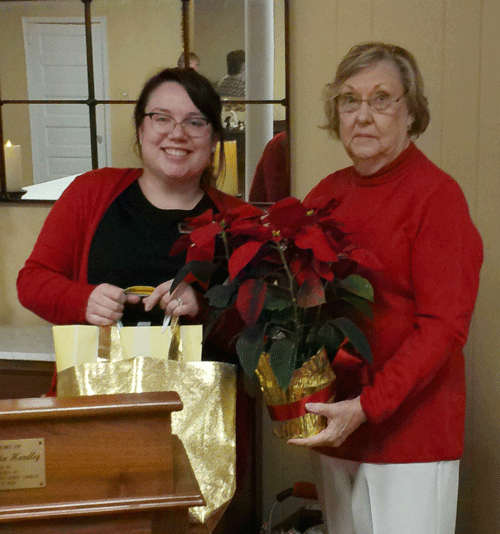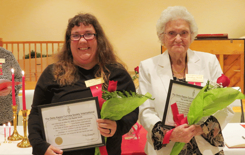 December 1, 2022 - President Dr. Sylvia Alston (right) presents Tiffany with a poinsettia, Gamma Chi bag, baby presents and a card stating that a donation of $50.00 will be given in her honor to the NC DKG Educational Foundation. |