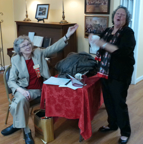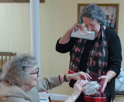 December 1, 2022 - World Fellowship Representative Loree Harris encourages the members to not make her cry by contributing to our annual World Fellowship Fund as Betsy Clark makes a contribution. |