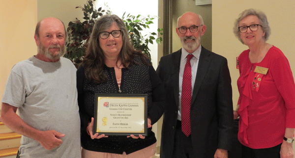 May 12, 2022 - From left, Fred and Kim Heisler accepting a $500 Nancy Blankenship Grant-in-Aid for their daughter Faith Heisler, presenter Richard Blankenship and Scholarship Chair Betsy Clark. |