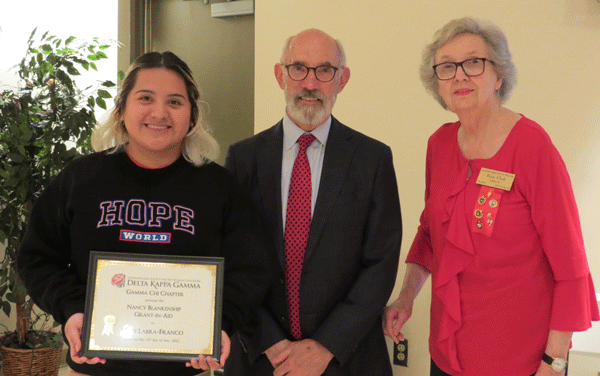 May 12, 2022 - From left, recipient Heidy Franco-Labra receiving a $500 Nancy Blankenship Grant-in-Aid, presenter Richard Blankenship and Scholarship Chair Betsy Clark. |