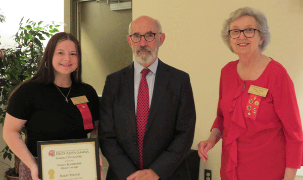 May 12, 2022 - From left, recipient Hailey Stroud receiving a $500 Nancy Blankenship Grant-in-Aid, presenter Richard Blankenship and Scholarship Chair Betsy Clark. |