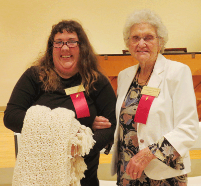 May 12, 2022 - Rachel Smith (left) is the lucky winner of the afghan crocheted by Josephine Myrick (right). Coincidentally, both women were inducted at the meeting. |