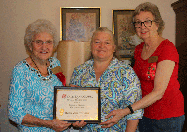 May 12, 2022 - From left, presenter Josephine Myrick, recipient Robin Edwards receiving a $500 Josephine Myrick Grant-in-Aid and Scholarship Chair Betsy Clark. |