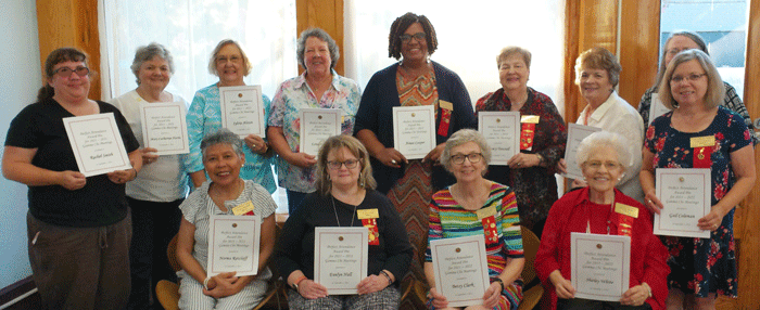 September 1, 2022 - Perfect Attendance Awards: sitting from left, Norma Retzlaff, Evelyn Hall, Betsy Clark and Shirley White; standing from left, Rachel Smith, Mary Catherine Harris, Dr. Sylvia Alston, Loree Harris, Aimee Cooper, Nancy Tunstall, Linda Hall, Sheila Robertson and Gail Coleman; not pictured, Sallye Duncan |