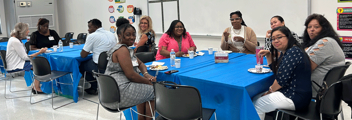 July 31, 2024 - Some of the new teachers and staff enjoying breakfast provided by Gamma Chi members. |
