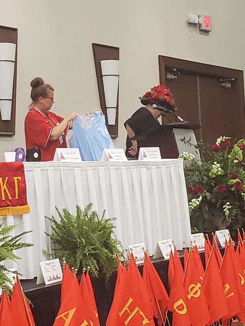 April 26, 2024 - The NC DKG Convention was held at the Sheraton Imperial Hotel in Durham, NC from April 26-April 28, 2024. Opening night was fun night. Convention Chair Nikki Steckroth, left, was jokingly holding up her nightgown to illustrate that we were supposed to wear after 5:00 clothes to the Saturday night banquet. Membership Chair Tammy Cullom got some laughs wearing her flower covered hat. Friday night consisted of tips from the Membership Committee, bingo, and ended with a dance. |