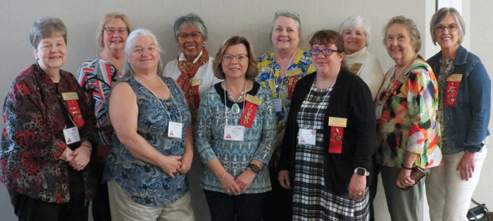 April 27, 2024 - Gamma Chi members attending the convention and supervising the Silent Auction were: front row from left, Robin Edwards, Gail Coleman and Rachel Smith; back row from left, Nancy Tunstall, Sallye Duncan, Norma Retzlaff, Sheila Robertson, Diane Colin, Dr. Sylvia Alston and Debra Clayton |