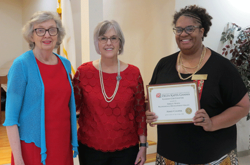 May 16, 2024 - Shirley White Professional Development Grant: from left, Scholarship Committee Chair Betsy Clark, presenter Debra Clayton and recipient Aimee Cooper (grant used to receive training certification) |