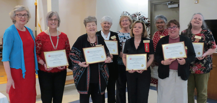 May 16, 2024 - Shirley White Professional Development Grants: from left, Scholarship Committee Chair Betsy Clark and recipients Debra Clayton, Nancy Tunstall, Diane Colin, Sallye Duncan, Gail Coleman, Norma Retzlaff, Rachel Smith and Sheila Robertson; not pictured Robin Edwards (gramts ised tp attemd the 2024 NC DKG Convention) |