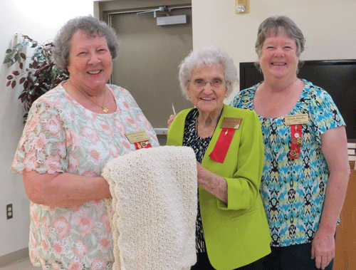 May 16, 2024 - from left, Loree Harris, the lucky afghan winner; presenter Josie Myrick; and Afghan Committee Chair Danylu Hundley |