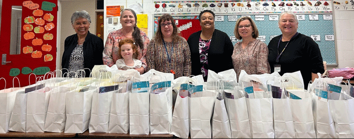 | November 12, 2024 - To welcome new teachers to Warren County, the following gathered at Mariam Boyd Elementary School to assemble goodie bags: from left, Beginning Teacher Support Committee Chair Norma Retzlaff, President Sheila Robertson, Rachel Smith, Kirby Alston, Gail Coleman and Robin Edwards along with Robertson's granddaughter Bellamy Alston. |