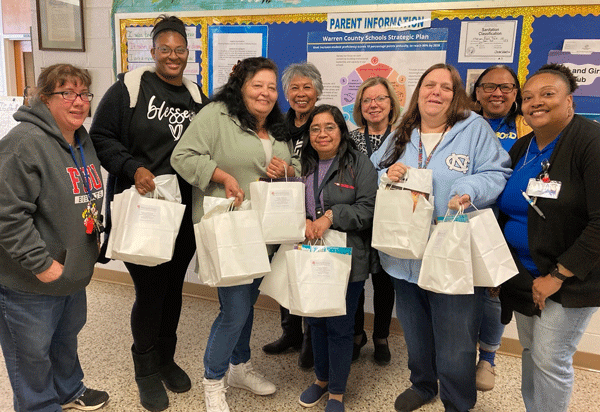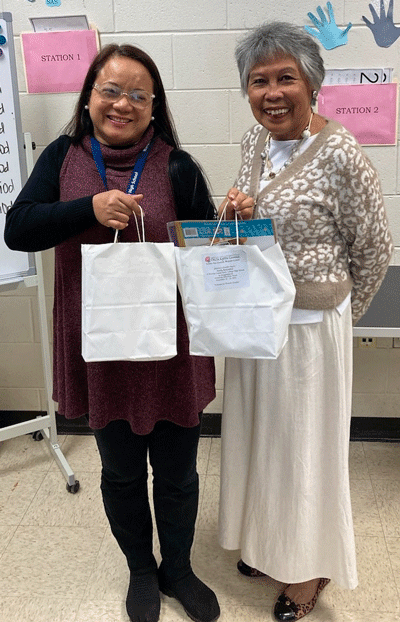 Goodie bags for new teachers were delivered to Warren Early College School during American Education Week in November 2024. Pictured from left are new teacher Acela Recentes and Beginning Teacher Support Committee Chair Norma Retzlaff. |