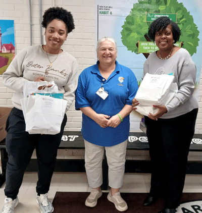 Goodie bags for new teachers were delivered to Vaughan Elementary School during American Education Week in November 2024. New teachers receiving bags are Lenesha Northington (left) and Sophia McMannen (right). Presenting the bags is DKG member Robin Edwards (middle). |