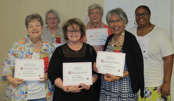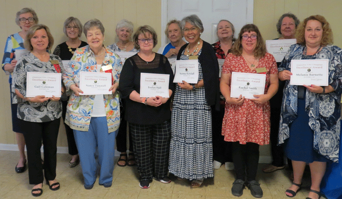 September 5, 2024 - Ten members were recognized for milestones in membership. They are, front row from left, Nancy Tunstall (25 years), Evelyn Hall (10 years), Norma Retzlaff (30 years); back row from left, Diana Bobbitt (20 years), Martha Ann Overby (35 years), and Aimee Cooper (10 years). Not pictured, Trina Paynter (15 years), Ashley Barnette (10 years), Jenny O’Meara (10 years) and Pattie Rodwell (5 years). |