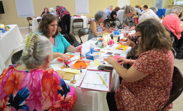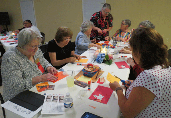 September 5, 2024 - President Sheila Robertson, standing, presented a program on making a fall greeting card using the Iris Card Folding Method. Here she is assisting members as they work on their card. |