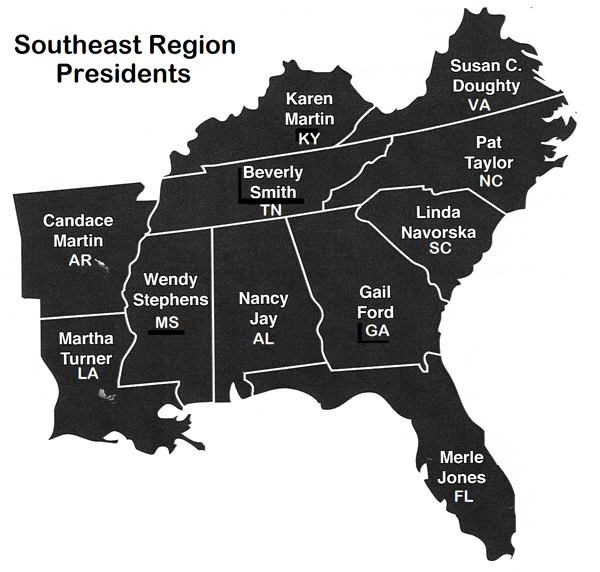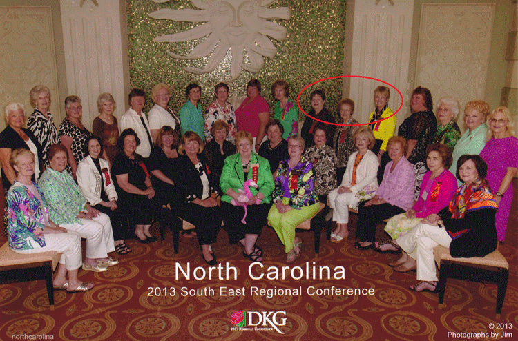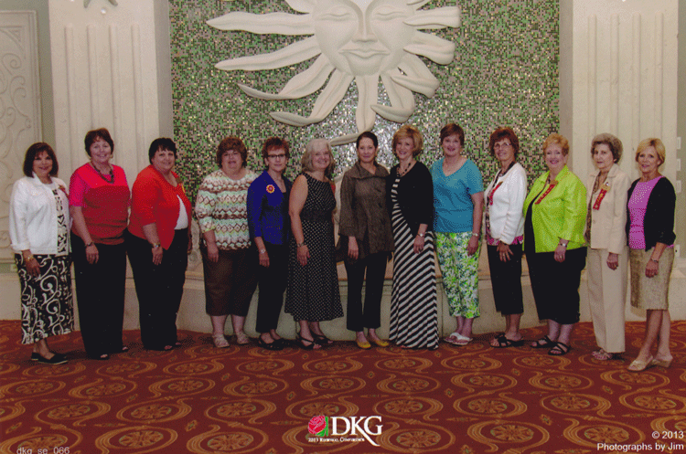 Southeast Regional Presidents (from left to right) Nancy Jay (MS), Wendy Stephens (AL), Martha Turner (LA), Susan Doughty (VA), Candace Martin (AR), Linda Navorska (SC), Southeast Regional Director Hanna Fowler, DKG International President Dr. Beverly Helms, Beverly Smith (TN), Karen Martin (KY), Pat Taylor (NC), Merle Jones (FL), and Gail Ford (GA) (Photographs by Jim) |