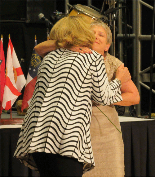 After 2017-2019 Eta State NC President Connie Savell (right) places the NC flag up front, Immediate Past Eta State NC President Sheila Groves gives Connie a hug and presents her with a red rose |