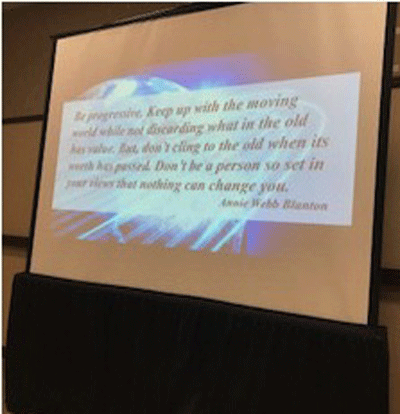 Posted was some wise words from our DKG founder, Dr. Annie Webb Blanton: "Be progressive. Keep up with the moving world while not discarding what in the old has value. But, don't cling to the old when its worth has passed. Don't be a person so set in your views that nothing can change you." |