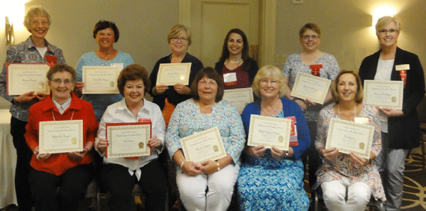 April 28, 2017 - President Debra Clayton, far right standing, displays Gamma Chi's Communications Excellence Award certificate along with the ten other recipients |