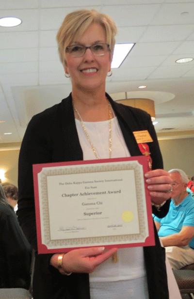 April 28, 2017 - President Debra Clayton displays Gamma Chi's Superior Chapter Achievement Award certificate |