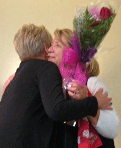 April 28, 2017 - President Debra Clayton, left, receives a hug from Eta State NC President Sheila Groves after Sheila presented Gamma Chi the Presidential Achievement Award which consisted of an engraved crystal vase with red roses, baby's breath and greenery |