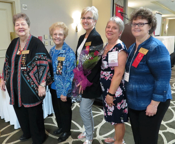 April 28, 2017 - Celebration time after the Friday night opening meeting; from left to right: Eta State NC & Gamma Chi Communications & Publicity Committee Chair Nancy Tunstall, Gamma Chi Treasurer Shirley White, Gamma Chi President Debra Clayton holding the crystal vase, Eta State NC First Vice-President Connie Savell (soon to be Eta State NC President) and Gamma Chi Nominations Committee Chair Evelyn Hall |